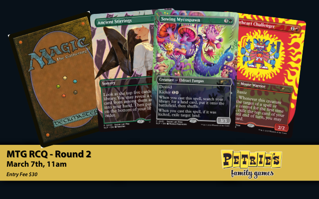 Remember, Petrie’s is a family friendly environment. No unfriendly trash talking, foul language, intimidation or inappropriate conversation. Managers and judges have the right to eject any player violating the house rules with no refund. By attending any event as a participant you agree to play by all house & game rules. Additionally, you understand that the Play Space and all events held within are a privilege & release Petrie’s Family Games of all liabilities.
